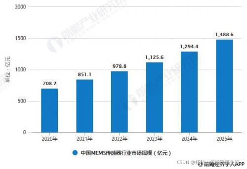 自2015年开始MEMS传感器市场规模稳步提升[2],产品需求大幅增加,在物联网的发展和智能终端领域也得到广泛应用,传感器产品需求大幅增加,重心逐渐转向技术含量较高的MEMS传感器领域。在 MEMS 传感器应用前景良好和国产化进程提速背景下,未来我国 MEMS 传感器市场前景广阔。前瞻产业研究院结合之前的发展数据预测,未来几年我国MEMS传感器市场规模年均增速保持在15%左右,预测到2025 年我国 MEMS 传感器市场将达到 1488.6 亿元[3]。