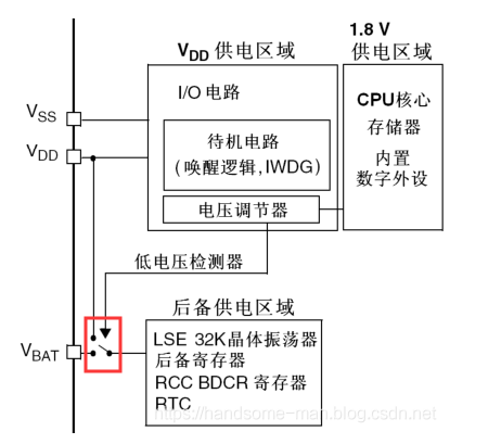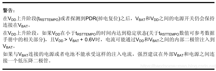 使用电池或其他电源连接到VBAT 脚上,当VDD 断电时,可以保存备份寄存器的内容和维持RTC的功能。