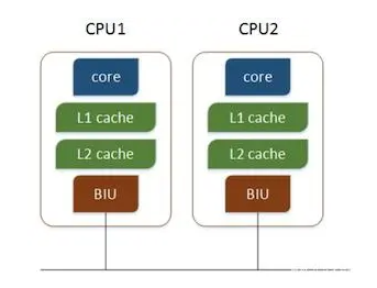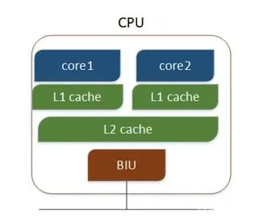 多核CPU,不同的核通过L2 cache进行通信,存储和外设通过总线与CPU通信