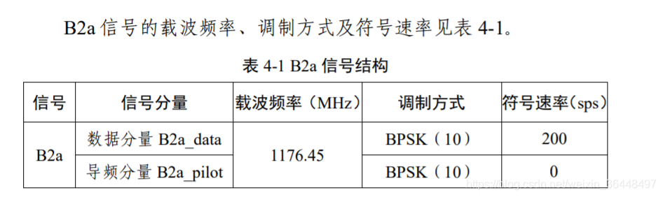 B2a 信号只在北斗三号中圆地球轨道 (MEO)卫星和倾斜地球同步轨道(IGSO)卫星上播发,提供公开 服务,地球静止轨道(GEO)卫星不播发 B2a 信号。B2a是以载波频率 1176.45 MHz 为中心 的 20.46 MHz 带宽内的 信号。采用功率归一化的复包络形式来描述信号调制方式。卫星发射信号为右旋圆极化(RHCP)。