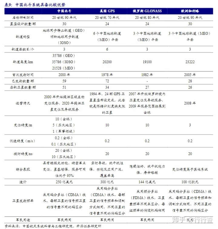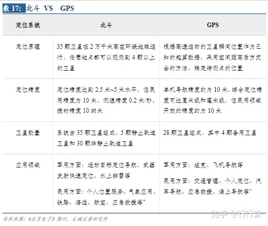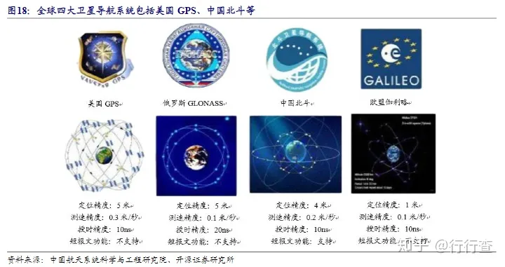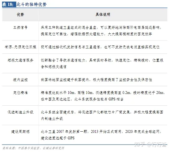 北斗系统具有相对优势。总体来看,北斗系统与GPS性能基本相当。具体来看,北斗具备的优势如下,1)抗遮挡能力强,低纬度地区性能优势明显。2)北斗特有的短报文通信功能,实现双向通信能力(卫星定位终端和北斗卫星或北斗地面服务站之间通过卫星信号传递信息),GPS只能单向通信(终端从卫星接收位置信号),应用场景更加丰富。在未来交通运行、渔业出海等专业领域具备较大优势,应用场景丰富。3)定位精度优于其他卫星导航系统。在军用领域,北斗系统精度将小于1米,处于世界先进水平。4)授时精度技术先进。斗三号采用铷原子钟和国产氢原子钟相结合的授时方式,误差小于10ns,稳定性强,时间测量更加精确。
