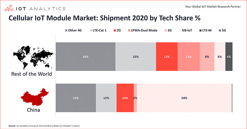 (蜂窝物联网出货量结构对比,来源:IoT Analytics)