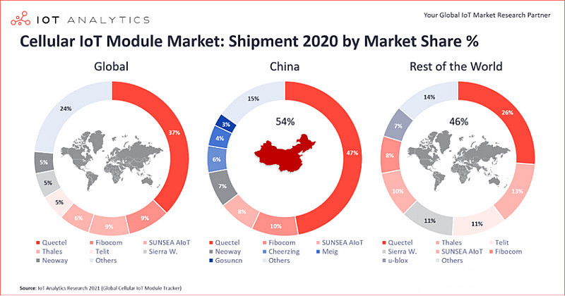 在蜂窝物联网模组供应商市场份额方面,IoT Analytics监测数据显示,2020年,从全球市场来看,移远通信、广和通和日海3家中国厂商出货量位于全球前三,3家总出货量占全球55%的份额。
