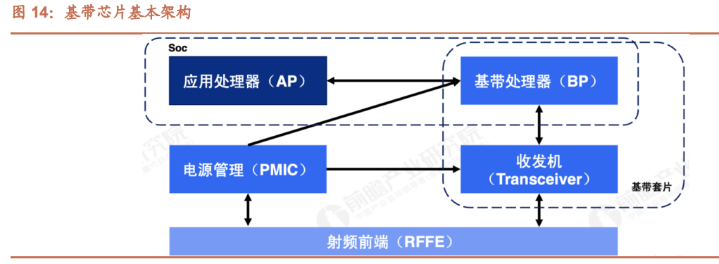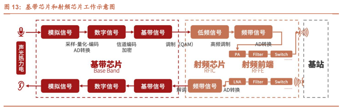 射频芯片负责射频收发、频率合成、功率放大;基带芯片负责信号处理和协议处理