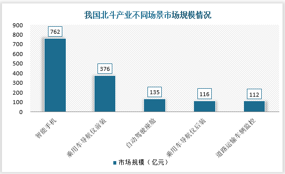 根据中国卫星导航定位协会的统计预测,2020年北斗产业市场规模超过4000亿元。其中主要消费市场智能手机市场规模约762亿元,占比最大;乘用车导航仪紧追其后(包括前装和后装),市场规模约为500亿元;自动驾驶座舱、道路运输车辆监控则分布约有135亿元、112亿元市场规模。