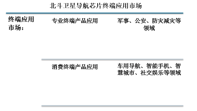 终端应用市场方面,国产的北斗卫星导航芯片应用市场非常广。目前,我国北斗芯片的终端产品分为专业终端产品和消费终端产品,前者包括军事、公安、防灾减灾救灾等领域的产品的应用,且该类应用对精度要求高且价格昂贵;后者包括各类导航终端,包括车用导航、智能手机、智慧城市等领域,这类应用市场准入门槛较低,市场规模更大。
