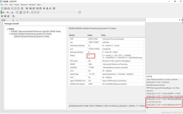 通过简单的接线,参考QiSCOPE的应用手册,根据基于Ntrip协议的高精度实现步骤,很容易收到NMEA数据,实现高精度定位。(测试在窗台上进行,所以信号环境不是很理想,只能达到5=Float RTK状态,开阔环境下应能达到4=Fixed RTK状态)