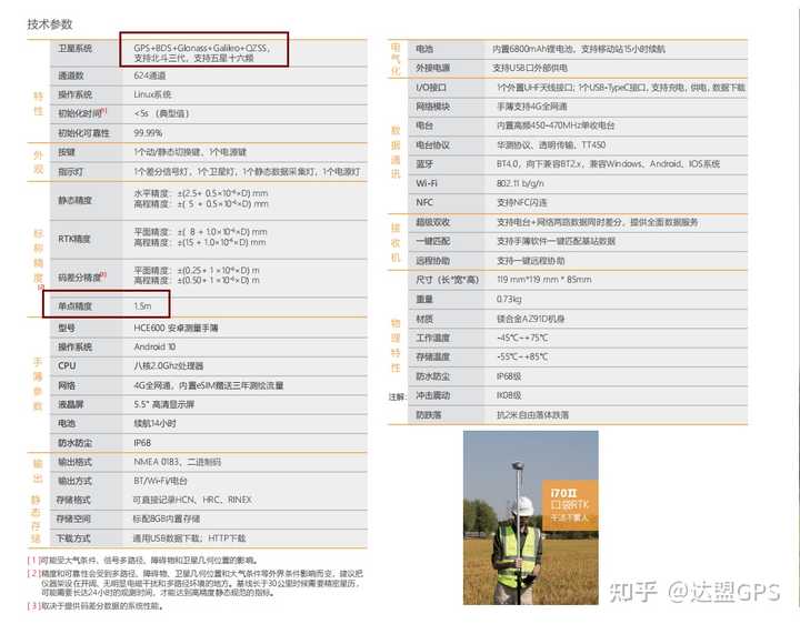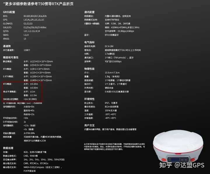 下面是司南的T50测绘级别的产品,7星30频,并行通道1198个,支持RTK,PPP,SBAS,带惯导,基本是顶配的高精度定位产品了。我们看单点定位精度可以到1米左右,SBAS星基差分精度也可以到1米左右,RTK精度在8mm左右。