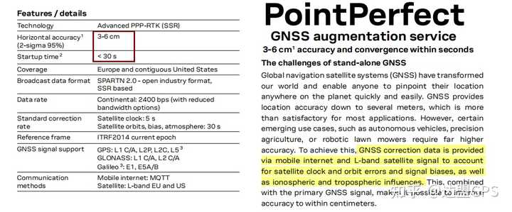 PPP一般通过网络或者卫星获取修正数据,单点定位在全球获得高精度的方法。PPP现在已经有很多服务商,基本都需要收费。相对于RTK的OSR(Observation Space Representation观测域修正),PPP属于SSR(State Space Representation状态域修正)。很多服务商能提供30秒左右的厘米级定位了。比如ublox的PointPerfect服务(PPP-RTK技术)。见下图: