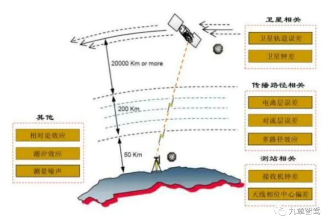 GNSS的定位误差,除了上文提到的电离层误差外,还有如下几种:卫星相关的卫星轨道误差(星历误差)、卫星原子钟的时钟误差、对流层误差、载波经过反射后的多径效应引起的误差,与接收机有关的接收机钟差等。