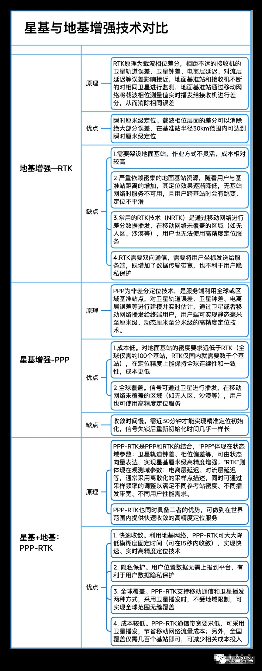 RTK/PPP/PPP-RTK对比,信息来源:九章智驾根据公开信息与专家访谈信息整理