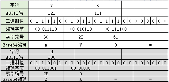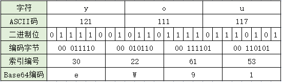 再根据字符索引关系表,每个字符编号对应一个字符,就得到了Base64编码字符