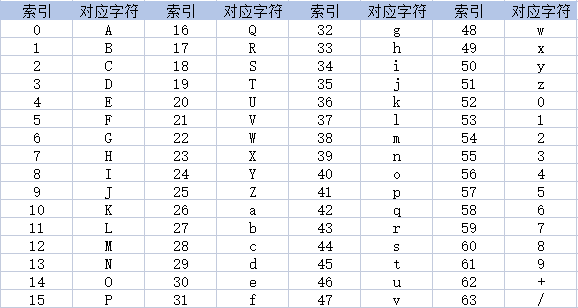 Base64是一种索引编码,每个字符都对应一个索引,具体的关系图,如下:
