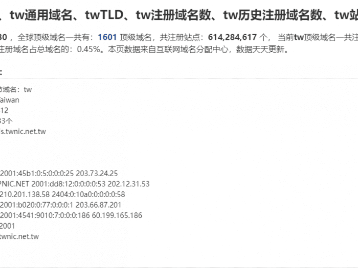 截止到 2022-08-30 ,全球顶级域名一共有:1601 顶级域名,共注册站点:614,284,617 个, 当前tw顶级域名一共注册站点:2,767,412个,在所有顶级域名中站点排名: 33 ,注册域名占总域名的:0.45%。本页数据来自互联网域名分配中心。