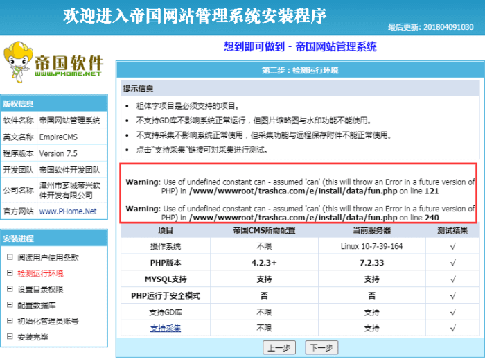 昨天晚上一个网友需要将服务器配置WEB且恢复他购买的帝国CMS程序数据,但是由于太晚就挂机安装WEB系统数据留着今天上午恢复。但是在恢复安装帝国CMS的时候有提示错误"Warning: Use of undefined constant can – assumed 'can' (this will throw an Error in a future version of PHP) in /www/wwwroot/www.****.cn/e/install/data/fun.php on line 121"。